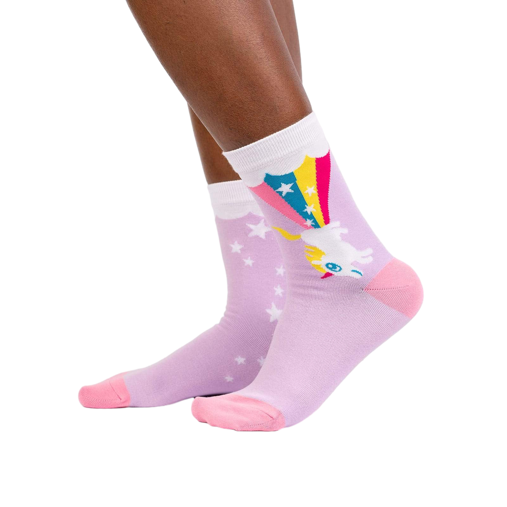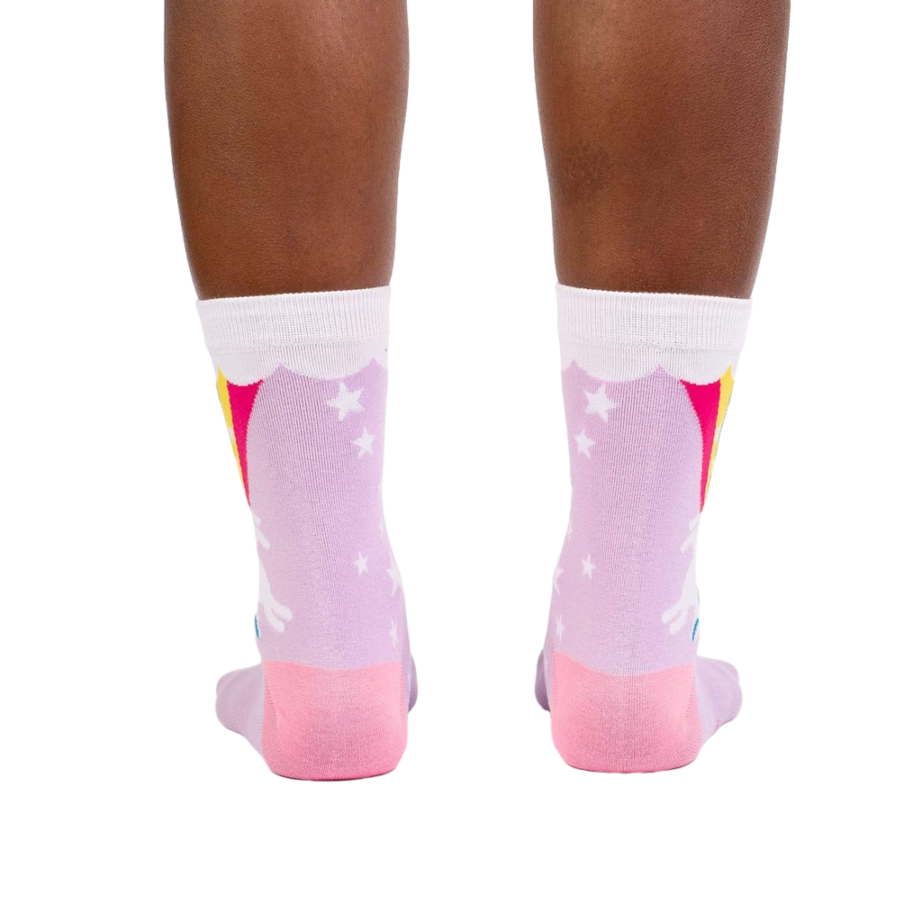 These 'Rainbow Blast' socks are seriously fun. The main color is a lovely lavender, and the design features a unicorn blasting off from a rainbow against a background of white stars. The visible parts of the sock have a pink heel and toe. They're crew socks, and the whole thing is just delightfully whimsical. Prepare for compliments!