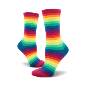 Let your feet celebrate in the fabulousness of our Rainbow Gradient Stripe socks! These crew-length beauties for women are covered in a vibrant spectrum of fuchsia, red, orange, yellow, green, blue and purple stripes, guaranteed to add a pop of panache to your step. Strut your stuff or simply relax in these rainbow-adorned socks that shout "Pride" with every step!