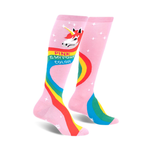Unicorns are magical creatures with rainbow manes and tails. They represent power, beauty, and uniqueness. Step into a realm of enchantment with our Rainbow Mane unicorn socks. With a bold pink background and vibrant text that reads "Pink is my power color," these knee-high socks will add a touch of whimsy to your wardrobe. Wear them during your next adventure or just to brighten up your day.