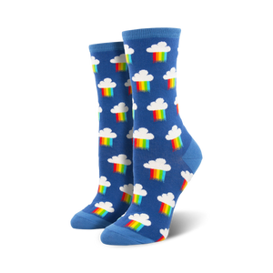Blue Crew socks with a pattern of cartoonish white clouds and rainbows on them. The theme is "Rainbow Rain," and the socks are designed for women. The design is fun, whimsical and lighthearted, perfect for adding a touch of playfulness to any outfit. Picture yourself skipping through a rainbow after a thunderstorm, heart bursting with joy, smile stretching from coast to coast.