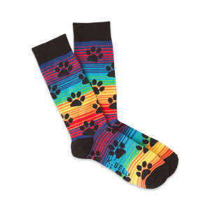 Rainbow Stripes Paw Prints! These colorful crew socks for men are printed with a pattern of rainbow-colored stripes adorned with black paw prints, and the toe and heel are black. They're perfect for dog lovers! Fun fact: Did you know that dogs have sweat glands in their paws? No wonder they sometimes smell like Fritos!