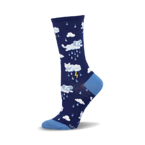 Even in the land of naps and dreams, there's a storm brewing! These socks feature snoozing white cats nestled among clouds, but don't let their peaceful slumber fool you. Yellow lightning bolts and raindrops add a touch of whimsical chaos to this blue backdrop. With a matching blue toe and heel, these socks are the perfect blend of calm and stormy vibes, making every step a playful adventure.