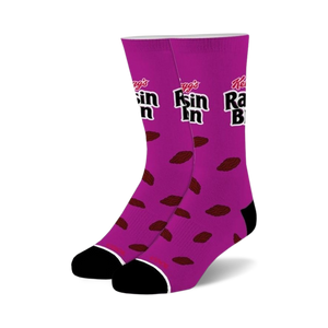 Behold the pinnacle of breakfast-inspired foot attire: the Raisin Bran Crew Socks! With their irresistible purple backdrop, these socks showcase an eye-catching pattern of plump, juicy raisins, ready to add a dash of sweetness to your steps. The black toe and heel add a touch of sophistication, like a tuxedo for your feet. Whether you're raisin' the roof at a dance party or bran-storming new ideas at work, these socks will keep your feet feeling fine. So, slip into a pair of Raisin Bran Crew Socks today and let the fruity fun begin!