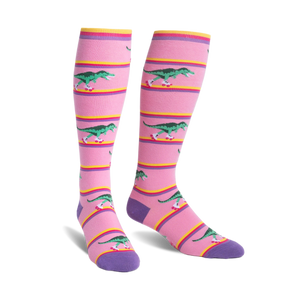 Time to hit the rink with a prehistoric twist! These fun knee-high socks come in a vibrant pink, crisscrossed with horizontal stripes in sunny yellow, lighter pink, and purple. The main event? Awesome green T-Rex dinosaurs, each one strapped into a pair of tiny white roller skates with pink wheels, ready to roll. You'll spot these groovy dinos all over the socks, from the cuff down to the purple toe and heel. The top cuff also has a playful stripe of yellow, pink, and purple. They're perfect for adding a bit of unexpected fun to your everyday.