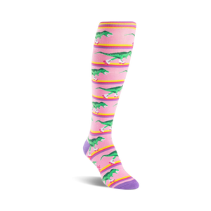 Rawr-ler Rink Knee High Socks for Women - Pink with Green Dinosaurs in Purple Roller Skates: Introducing the Rawr-ler Rink Knee Highs - a vibrant explosion of dinos and roller skating joy! Picture this: a gang of green dinosaurs, rocking purple roller skates, gliding across a backdrop of pink and yellow stripes. These socks are a whimsical reminder that even the most serious dinos can have a little fun. Made for women who love to add a dash of playfulness to their everyday style, these socks are perfect for showing off your wild side. So, next time you're feeling the need to unleash your inner dino, slip on these knee-highs and let the skating shenanigans begin!
