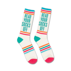 Sock it to 'em with our "Read Your Socks Off" novelty socks! These spirited crew socks boast vibrant white, blue, orange, and pink stripes, while the bold black text declares your love for the written word. Whether you're a bookworm, a student, or just someone who appreciates a good pun, these socks will have you reading between the toes all day long. Share your literary style and add a touch of fun to your everyday wardrobe with these statement socks.