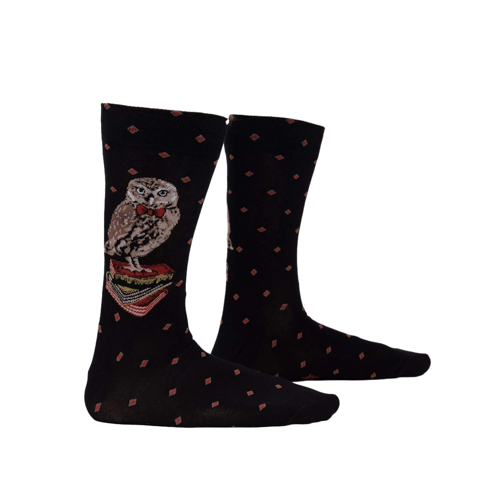 Ever wish you had the wisdom of an owl and the reading prowess of a bookworm all on your feet? Look no further! These black crew socks are here to bestow upon you the gift of knowledge -- perhaps even a hoot or two! Our furry owl mascot is perched atop a tower of books, ready to impart only the best dad jokes and wisdom -- all while wearing an adorable red bowtie. Feeling stuck in your reading slump? These socks will help you soar to new heights. Guaranteed to be the wisest socks in your drawer -- they're a wise choice, indeed.