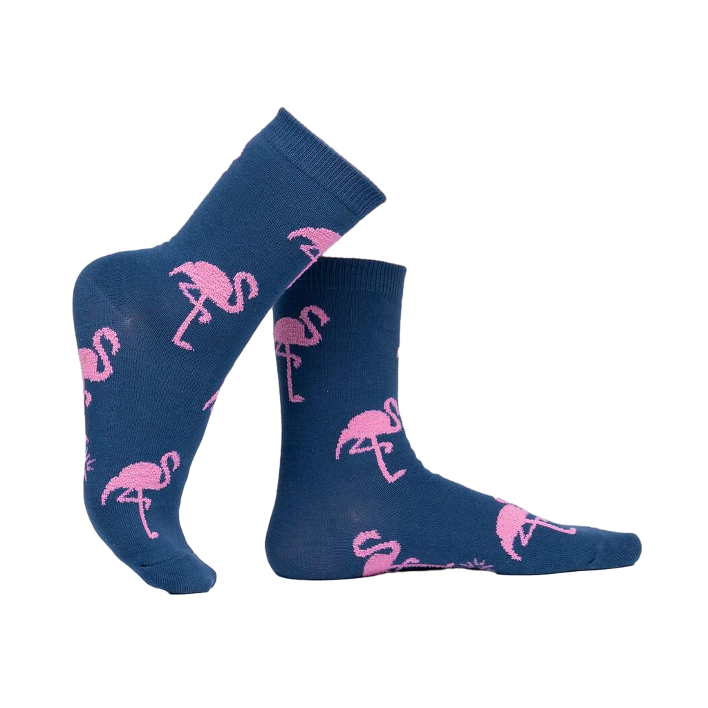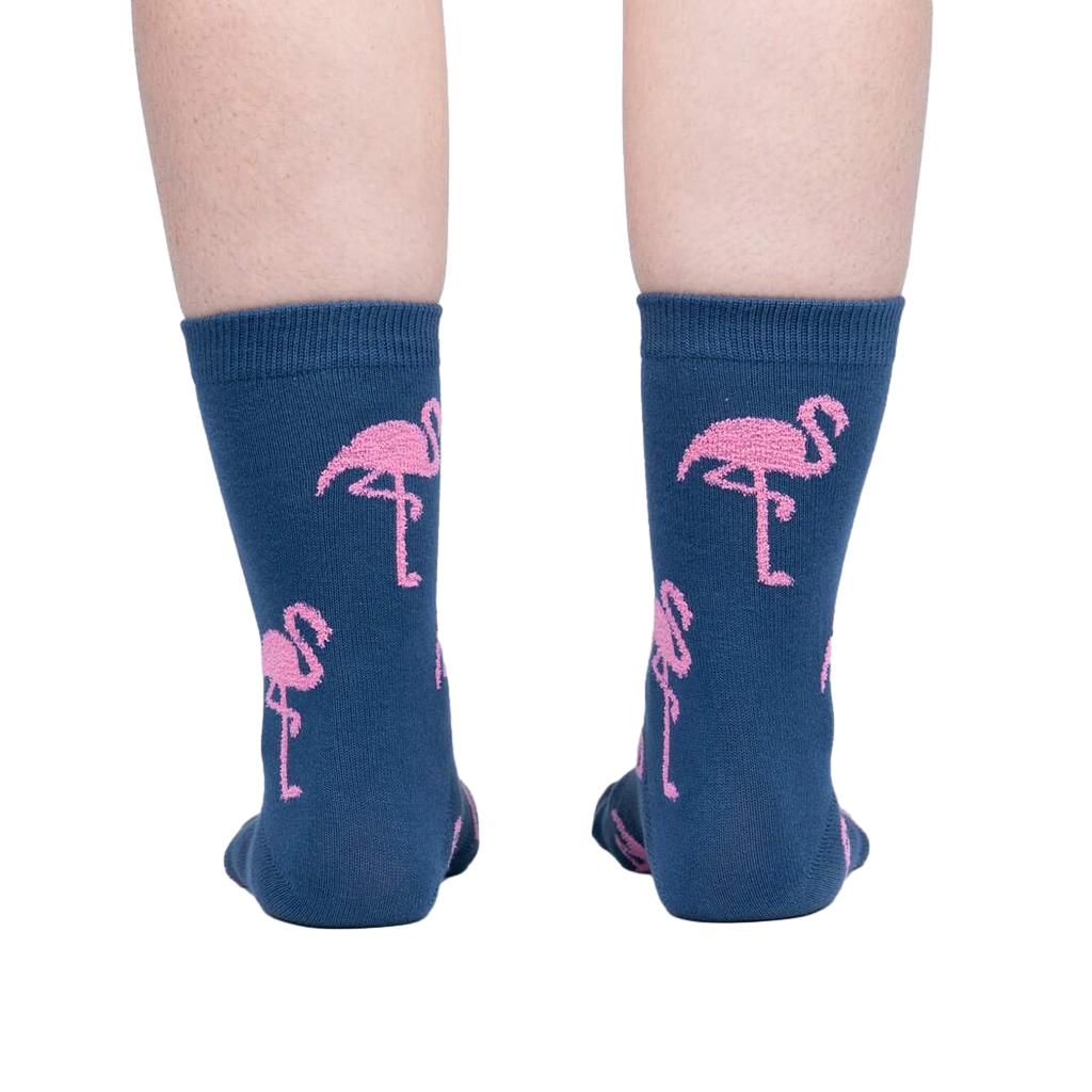 Ready-Set-Flamin-go! These striking, deep blue crew socks are printed with bright pink flamingos poised for a dash through the water or a jaunt across a lawn. Be the best-dressed at the pool party or just show the world your penchant for fun socks and all things flamingo!