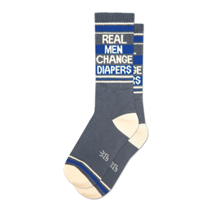 Sporting a no-nonsense message, these socks come in a solid grey color. The main event is on the upper leg, where bold blue stripes carry white block letters spelling out 'REAL MEN CHANGE DIAPERS.' Thin white horizontal stripes separate the blue sections, giving it a clean look. The top cuff is ribbed for a snug fit. Down on the foot, you'll spot a contrasting cream color on the heel and toe, with more blue and white stripes wrapping around the arch area. There's also a small, distinct logo visible on the sole, near the toe. Comfy crew socks that truly make a statement.
