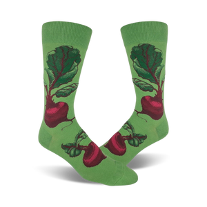 Kickstart your daily harvest with Red Beets novelty crew socks! These food-themed socks feature a vibrant green background teeming with red beets, complete with verdant leaves and earthy brown stems. With every step, you'll feel like you're strolling through a farmers market, surrounded by the freshest veggies. Perfect for the foodie or gardening enthusiast in your life, these socks add a dash of whimsy to any outfit. Who knew beets could be so darn fun?
