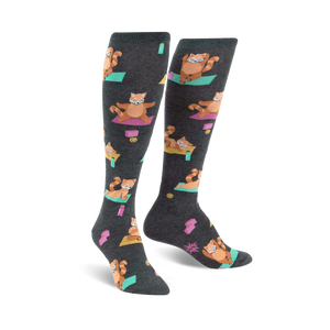 Get ready to strike a pose with the Red Panda Pose socks! These knee-high wonders for women feature a delightful pattern of red pandas practicing yoga in various poses, from downward-facing dog to tree pose. With these cuties on your feet, you'll channel your inner yogi and feel the zen wherever you go. Plus, the gray background with the yoga mat and "Namaste" symbol brings the whole theme together perfectly. Get ready to downward dog in style with the Red Panda Pose socks!