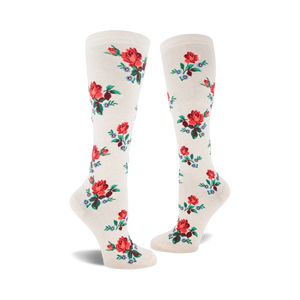 Picture this: slipping your feet into a pair of Red Rose socks and stepping into a world of beauty, elegance, and undeniable floral charm. These knee-high socks for women feature an exquisite pattern of red roses and blue flowers blooming amidst a soft cream-colored background. The vibrant hues and intricate details will add a touch of sophistication and elegance to any outfit, making you feel like a walking garden of delight. Wear them proudly and let the world bask in the radiant beauty of your feet.