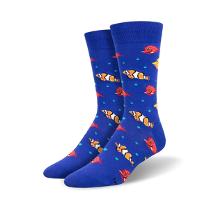 Clownfish wish they could be this cool. Show your finsanity and dive into these reef life socks so fishionably designed with underwater cartoon clownfish and red fish dancing across a sea of blue. Sure they're for men, but we hope you don't flounder around when making your decision!
