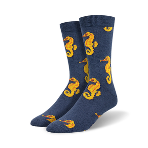Deep dive into the fabulous world of Regal Seahorse socks! These navy blue wonders feature a school of happy, yellow seahorses swimming all over. Perfect for men who love a pop of color and appreciate a good sea pun. Fun fact: did you know baby seahorses are called fry? You'll fry-ten your friends in these!