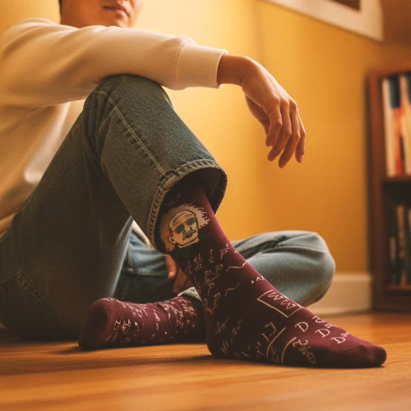 Get ready to rock the nerdiest, rad socks on the planet! These maroon crew socks feature Albert Einstein sporting some cool blue shades. Dig the equations and symbols floating around in the background as you channel your inner genius. Talk about #EinsteinSwag!