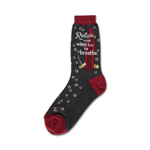 Relax and pour yourself a glass of your favorite red. Put your feet up and slip into these comfy crew socks with red accents and a pattern of corkscrews and corks on a field of black. Show em' off the next time you uncork a bottle and let that wine breathe.