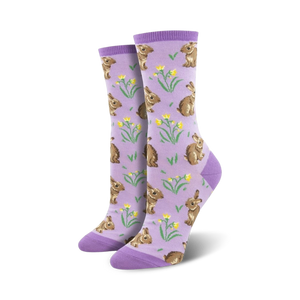 Who says socks can't be exciting? Hop into the Relaxed Rabbit crew socks and let the playful pattern of brown bunnies frolicking amidst cheerful yellow flowers put a spring in your step. These purple socks for women are sure to make a hoppy statement wherever you go. So embrace your inner bunny and get ready to hop down the rabbit hole of style!