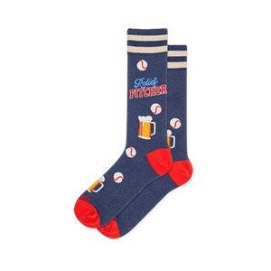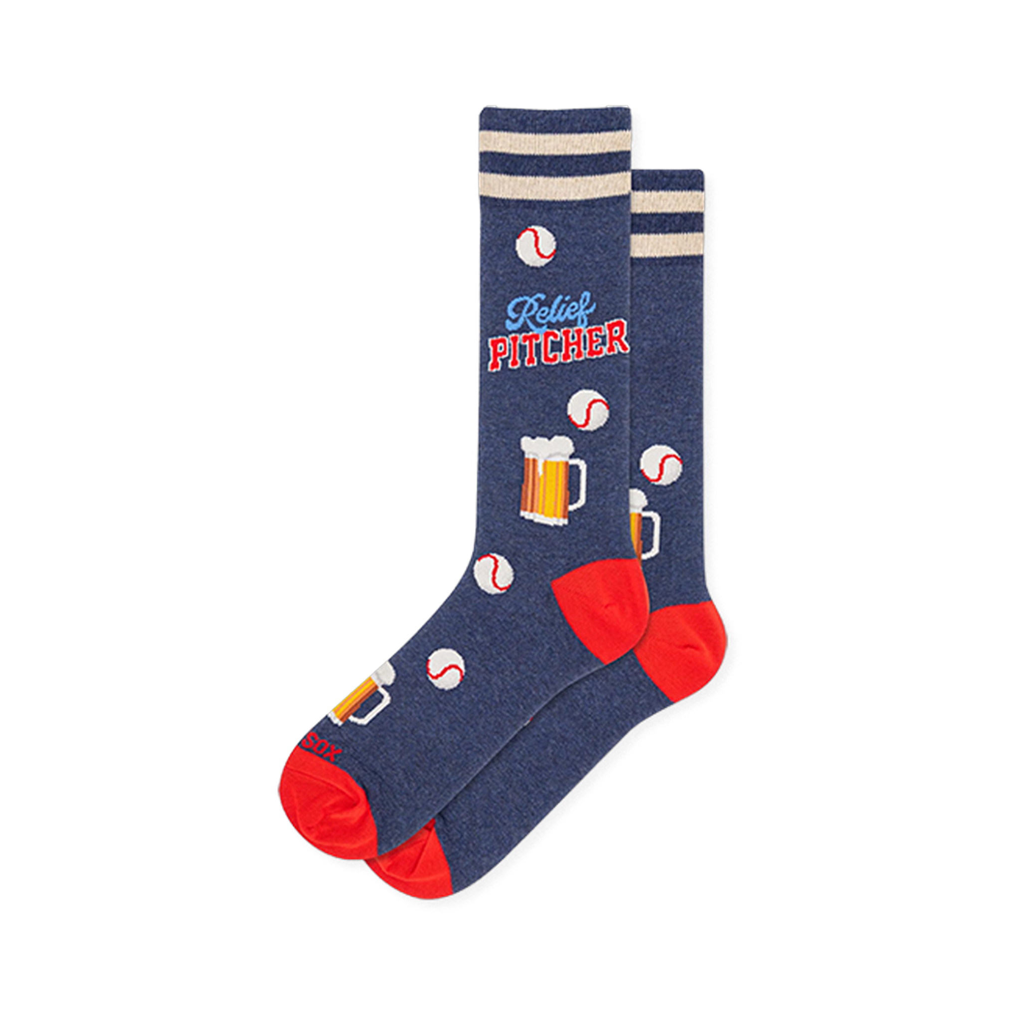 The crew length gives these socks a classic profile that works well with sneakers, boots, or your favorite weekend shoes, while the bold graphics keep them from blending into the background. The mix of baseballs, frosty mugs, and the Relief Pitcher wording gives the pair a playful edge without trying too hard. They make an easy choice for game day, casual Fridays, or anyone whose wardrobe could use a little more clubhouse humor.