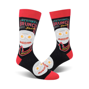 Elevate your brunch game with Resting Brunch Face socks! These comfy crew socks boast a striking black base accented with a vibrant red toe, heel, and top. The real showstopper is the hilarious graphic: a plate brimming with bacon and eggs, topped with the slogan "Resting Brunch Face 24 Hours." Whether you're a breakfast enthusiast, meme aficionado, or just love a good pun, these socks are sure to tickle your funny bone. So grab a pair and let your feet do the talking at your next brunch gathering.
