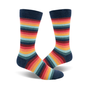 Take a vibrant trip back in time with our Retro 70s Crew Socks for men! These groovy socks showcase a kaleidoscope of horizontal stripes in blue, red, orange, yellow, green, and light blue, reminiscent of a psychedelic sunset. Slip into a pair and let the nostalgia wash over you like a wave of far out vibes. Unleash your inner flower child and rock these socks with bell bottoms, platform shoes, and a tie-dye shirt for a totally tubular look.