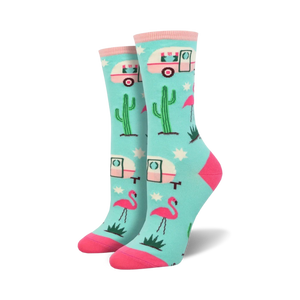 Take a trip down memory lane with our groovy Retro Camper Crew Socks! These fun socks for women feature a pattern of pink flamingos, green cacti, and white vintage campers. Let your toes experience the freedom of the open road. You won't believe your eyes when you see how well these socks complement your favorite pair of jean shorts and sandals.