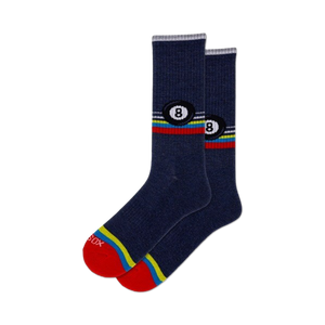 There's no poolin' around with the Retro Eight Ball Socks! These black crew socks make a statement with a captivating pattern of eight balls in black and white. Each sock is encircled by four vibrant stripes in yellow, red, blue, and green, giving them a bold and playful retro vibe. Mens will appreciate these comfortable socks while shooting pool, hanging out, or simply adding a splash of fun to their everyday look. Go ahead, take aim for some sock-cess and cue-riosity with the Retro Eight Ball Socks!