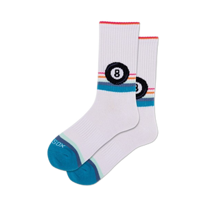 Retro Eight Balls: These socks are like a trip back in time! With a black eight ball in the middle, surrounded by vibrant rings and a groovy blue and orange stripe pattern on top. Ladies, jump into these crew socks and let them transport you to a simpler time. Wear them with pride knowing that you're rockin' socks that are out of this world.