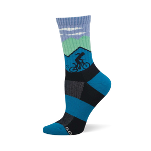 These women’s crew socks turn a trail scene into a compact graphic that feels ready for the outdoors even when the day is more errands than elevation. A cyclist climbs through bold blocks of color, with ridgelines and a wide-open sky giving the design a sense of motion and space. The result is playful, a little adventurous, and easy to wear with jeans, joggers, or hiking boots.
