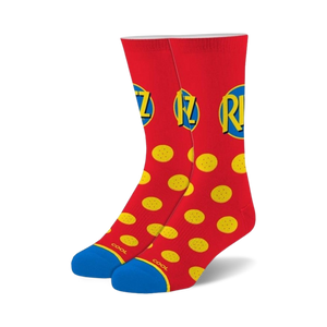Ritz Cracker Socks: Get ready to feel snazzy in these red socks adorned with cheerful yellow polka dots and a blue heel and toe. Contrary to their name, these socks won't end up in a cup of soup ”they're just plain scrumptious. Perfect for both men and women, they're guaranteed to leave your feet craving more! (Also available in ankle length)