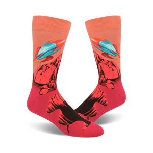Channel your inner Buzz Lightyear and prepare for sock-sational adventures with our "Rocket from the Red Planet" socks. These red and orange rockets are boldly soaring through space amidst black and white geometric shapes, leaving you ready to boldly go where no feet have gone before! Blast off with a sock-sational journey today!