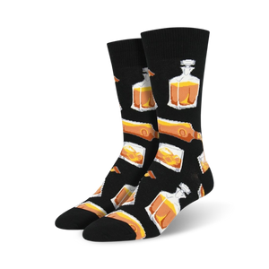 Do you love your bourbon neat or on the rocks? Some people love beer and some prefer wine. But if you love spirits made of distilled fermented grains, you will appreciate these cool men's novelty socks. Each awesome pair features decanters and glasses filled with liquid gold printed all over against a black background.
