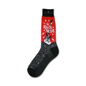 Feeling like a rockstar? Then these socks are for you! These black socks with gray flourishes and red and white accents definitely rock. With a red section at the top boasting a white star and the word "Rockstar" in white with a black shadow, you'll be walking on sunshine. Below, black sections with gray flames and white and red skulls make these socks perfect for any music fan. Whether you're rocking out at a concert or just rocking your everyday style, these socks will make you feel like a star.