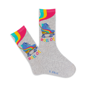 Love to roll? Then these socks are sure to get your wheels turning! Meet Roll On, the rad gray socks with a stunning showcase of retro-style blue roller skates in motion, embellished with yellow wheels and hot pink laces. With a background painted in a rainbow of colors, these socks are a vibrant tribute to the classic pastime of roller skating. Whether you're rolling on the boardwalk or just kickin' it at home, these cool socks will have you ready to jam to the beat. Available in women's crew sock size.