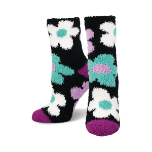 Room to Bloom Fuzzy Socks: These black crew socks for women showcase a colorful mix of vibrant blooms in white, green, purple, and blue. Adorned with flowers of many sizes and shapes, they're an enchanting reminder to embrace growth and bloom wherever you go. Let your feet blossom with these fun and flowery Room to Bloom Fuzzy Socks!