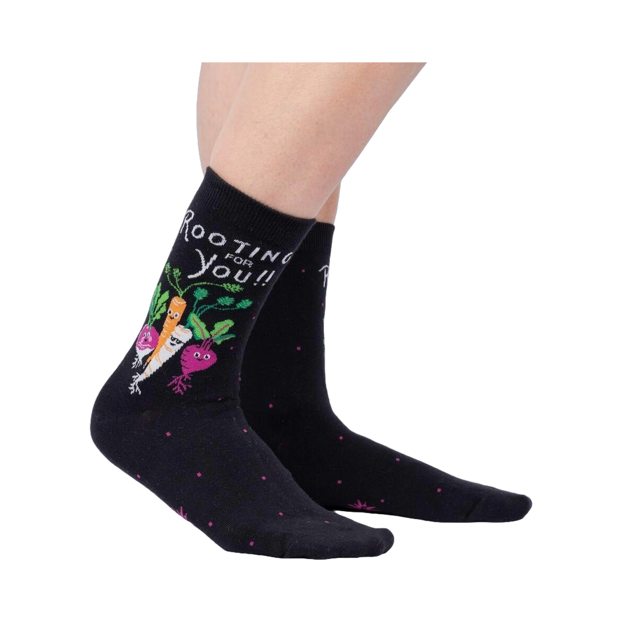 Rooting for You Socks: Polka dots are so yesterday! Kick boredom in the roots with our Rooting for You Socks. These lively black socks are covered in pink polka dots and adorned with a carrot, beet, radish, and turnip. So whether you're conquering the garden or just lounging around, you'll be reminded that you've got a whole squad of veggie pals rooting for you!