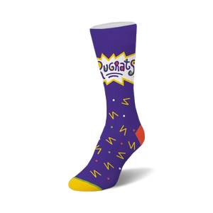 Rugrats Confetti: The socks are our piece de resistance sure to leave even Angelica Pickles green with envy. They've got purple feet and heels and colorful Reptar-themed shapes and characters all over them. Chuckie, Tommy, Dil, and Angelica are there to keep your feet company, wherever you're headed. It's time to get your Rugrats on!