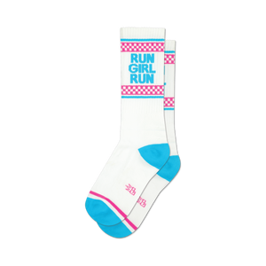 Lace up, dash off, and let your feet do the talking with our "Run Girl Run" socks! These aren't just any socks—they're your new secret weapon for the track, the gym, or anywhere your sneakers take you. Decked out in a snazzy white and pink checkered pattern with sporty stripes to match, they scream less "pretty in pink" and more "swift in stripes." And for those moments when you're zooming past the competition? The playful "Run Girl Run" message emblazoned in vibrant pink is not just a statement, it's a dare. So, why walk when you can run, and why run when you can fly? With these socks, it's not just about speed; it's about style with a wink.