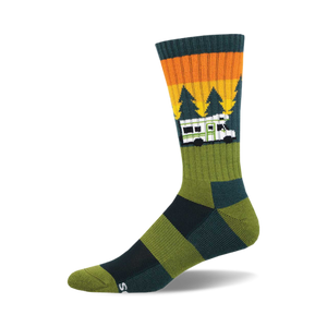 Let the adventure begin right at your feet with our "RV There Yet?" socks! These crew length charmers paint a picturesque scene of miniature white RVs cruising among vibrant orange and yellow pine trees on a snug dark green canvas. Bold orange tops, highlighted with yellow stripes, capture the fiery sunsets you love while the sturdy black bottoms nestle in the underbrush. Heading to a campsite, cozying up at home, or gifting a fellow traveler? These socks are just the ticket for adding a pinch of wilderness whimsy to any occasion. Why keep the wild waiting? Pull on a pair and let's roll into fun!