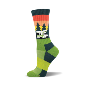 If your feet had a travel wishlist, top of the list would be our 'RV There Yet?' socks. Decked out in snazzy orange and green with a charming RV illustration wrapped around the leg, these merino wool masterpieces are your perfect road trip companion. Forget about just keeping comfy—these socks are about making every mile a statement. Whether you're hitting the highway or just lounging at the campground, let your feet take a journey into comfort with a side of style.