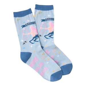 If you are a Sagittarius yourself or you know a Sagittarius, then you likely can attest to their adventurous side! Show off your no-back-down attitude with these cool novelty socks to suit your birthday month. Each fun pair of blue crew socks features a heavenly print of arrows and stars with a strong Sagittarius centaur above the ankle.