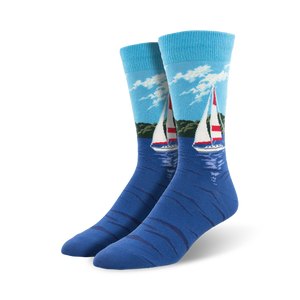 You'll need a sailing permit to wear these blue crew socks! Sailboat socks with billowing red sails, blue skies, white clouds and choppy seas await your toes. These nautical themed socks are perfect for going with the flow, or for getting a foot in the door of the local yacht club. Set sail today, because if the shoe fits, wear it!