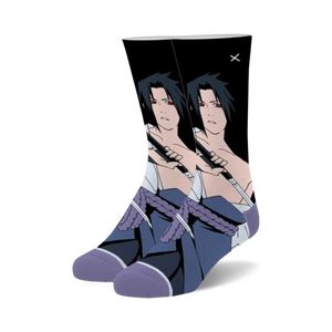 Unleash your inner ninja with Sasuke socks! These black crew socks feature a vibrant design of the iconic anime character, complete with his spiky black hair, red eyes, and signature purple outfit. Whether you're battling it out in the Hidden Leaf Village or just kicking back at home, these Naruto-inspired socks will add a touch of anime flair to your everyday style. Naruto's got your back - or your feet, rather.