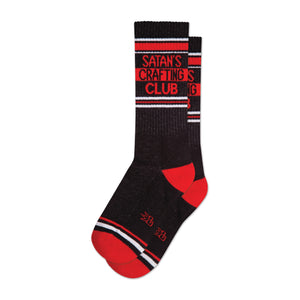 These aren't your grandma's knitting socks. Satan's Crafting Club socks are dark, cool, and surprisingly comfy. The main color is black with a subtle sparkly texture. Visible red and white stripes run across the top, under the words 'Satan's Crafting Club' in bold red lettering. The red continues at the cuffs. A small, barely visible symbol is shown at the bottom. They're crew socks, and perfect for anyone who appreciates a little bit of dark humor with their handmade projects.