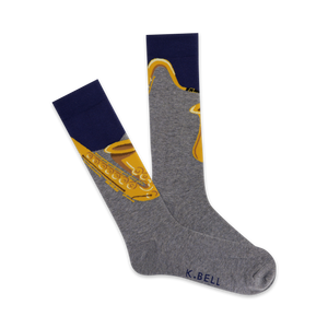 Excuse the pun, but these Saxophone socks are sure to blow you away! Be the hippest cat and strut your stuff in these cool, gray Saxophone socks with their bright yellow saxophones and dark blue background. Whether you're a sax player, a jazz enthusiast, or just appreciate unique designs, these Saxy socks are sure to set the tone for a fun and lively day. Oh, and did you know that saxophones were invented in Belgium in 1840 by Adolphe Sax? Now that's a fun fact to drop at your next gig, jam session, or sock-admiration gathering!
