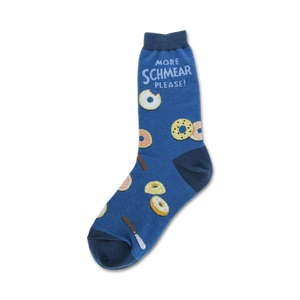 Calling all bagel enthusiasts! Spice up your sock game with "Schmear," our vibrant crew socks designed to satisfy your bagel cravings. Picture this: a cerulean canvas adorned with cartoonish bagels and tiny knives, accompanied by the playful plea, "More schmear please!" With every step, you'll be met with a smile and a hearty "mazel tov!"