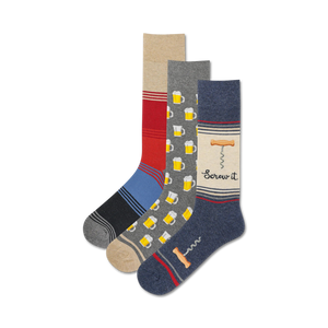 Get ready to uncork a world of fun with our Screw It 3-pack of socks! Featuring a playful pattern of beer mugs and corkscrews on a vibrant blue, gray, and red background, these socks are the perfect addition to any beer enthusiast's wardrobe. Slip into a pair and let the good times flow, whether you're enjoying a cold one with friends, kicking back at a backyard BBQ, or just unwinding at home. These crew-length socks are comfy, stylish, and sure to get a chuckle from your fellow beer lovers. So raise a glass, put on your Screw It socks, and let the good times roll!