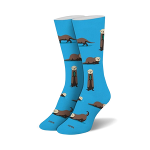 Sea otters are known to hold hands while they sleep to keep from drifting apart. Now you too can drift into slumber clutching a cartoon sea otter on your feet! Our Sea Otter Crew Socks are as playful and energetic as the animal that inspired them. These socks are blue and covered in cartoon sea otters holding fish. They're the perfect way to add a touch of fun to your wardrobe and brighten up the day of that special sea otter lover in your life.