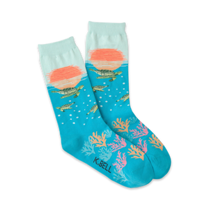 Hit the beach and catch some salty waves. You may stumble upon a beautiful sea turtle or two! These cool novelty socks is perfect for coming out of your shell. Each fun pair of blue crew socks features a stunning sunset over the ocean with a beautiful family of sea turtles enjoying the sea.