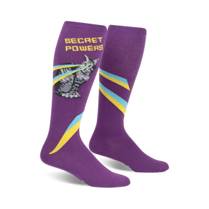 Cat's got your tongue? If not, prepare to be charmed off it with these Secret Powers knee high socks! The purple base of these funky felines will turn your legs into a magical mystery, and the mystical one-eyed cat with rainbow lasers will strike awe into the hearts of your enemies. Meow!