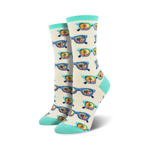 Do you enjoy hanging out at the beach and soaking in the rays? Well, look good doing it with a pair of these fun women's novelty crew socks! Each cool pair features sunglasses with palm trees in its reflections printed all over against a white background. The cuffs, heels, and toe lines are light blue.